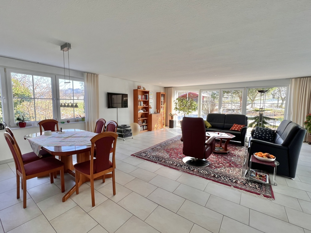 Über das Wohnzimmer gelangen Sie auch auf die schön angelegte Terrasse des Hauses bzw. in den Garten.