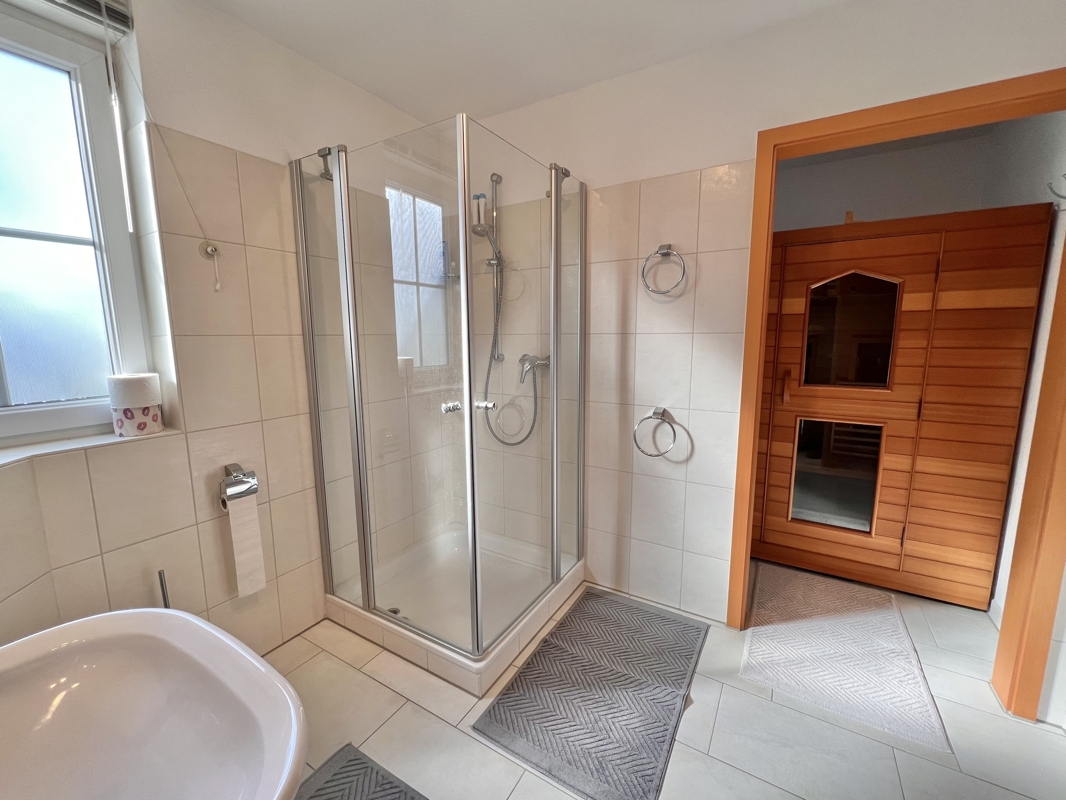 Auf der rechten Seite ist ein Badezimmer (Dusche), sowie eine weitere Räumlichkeit mit Infarotsauna.