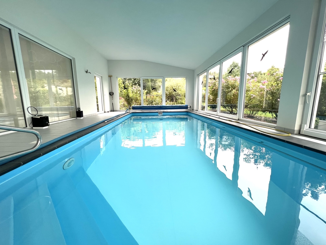 Weiter gelangen Sie in das einzigartige Hallenbad (ganzjährig beheizt). Die Technik wurde 2021 erweitert, so dass eine LAN gesteuerte Überwachung des Beckenwassers möglich ist.