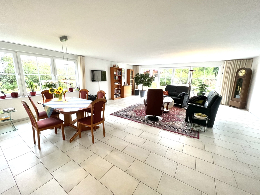 Über das Wohnzimmer gelangen Sie auch auf die schön angelegte Terrasse des Hauses bzw. in den Garten.
