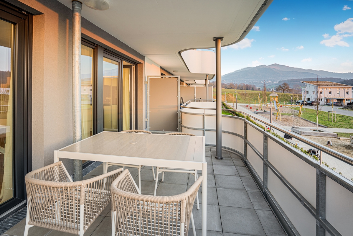 Ein tiefer Balkon erstreckt sich vor dem Wohnzimmer - der