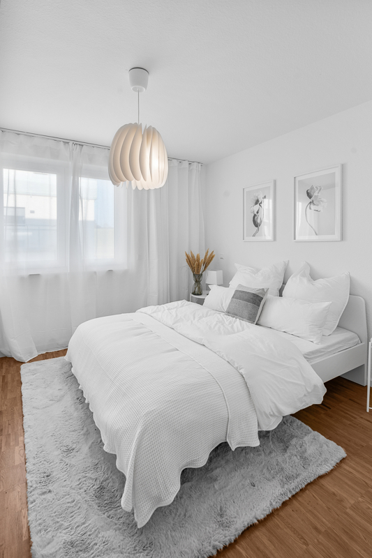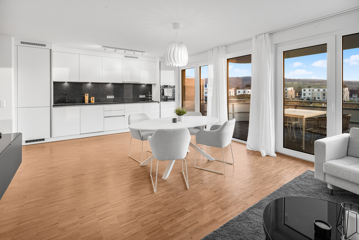 Großzügig, hell und weit präsentiert sich das Wohnzimmer. Klares Weiß kontrastiert mit warmem Eichenholzparkett. Große Balkontüren mit Panoramafenstern.