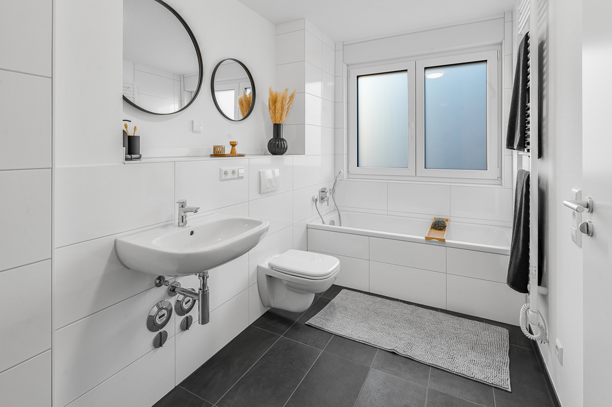 Im Bad erwartet Sie klassisches Schwarz/Weiß mit einer gemütlichen Badewanne und einer großzügigen bodengleichen Dusche. Das Gäste-WC bietet zusätzlichen Komfort.